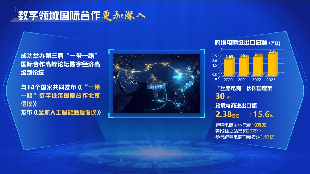 《報(bào)告》指出,數(shù)據(jù)安全制度體系基本形成,出臺(tái)全球首部專門規(guī)范生成式人工智能服務(wù)的規(guī)章——《生成式人工智能服務(wù)管理暫行辦法》。積極拓展數(shù)字領(lǐng)域國際合作,成功舉辦第三屆“一帶一路”國際合作高峰論壇數(shù)字經(jīng)濟(jì)高級別論壇等,我國“絲路電商”伙伴國增加到30個(gè),跨境電商進(jìn)出口額達(dá)2.38萬億元。
