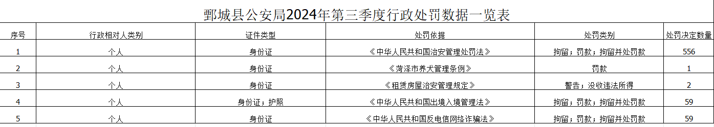 鄄城縣公安局2024年第三季度行政處罰數(shù)據(jù)一覽表