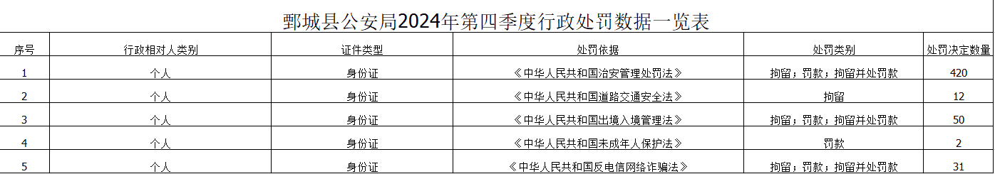 鄄城縣公安局2024年第四季度行政處罰數據一覽表