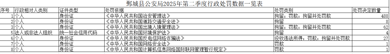 內容概述: 鄄城縣公安局2025年第二季度行政處罰數據一覽表