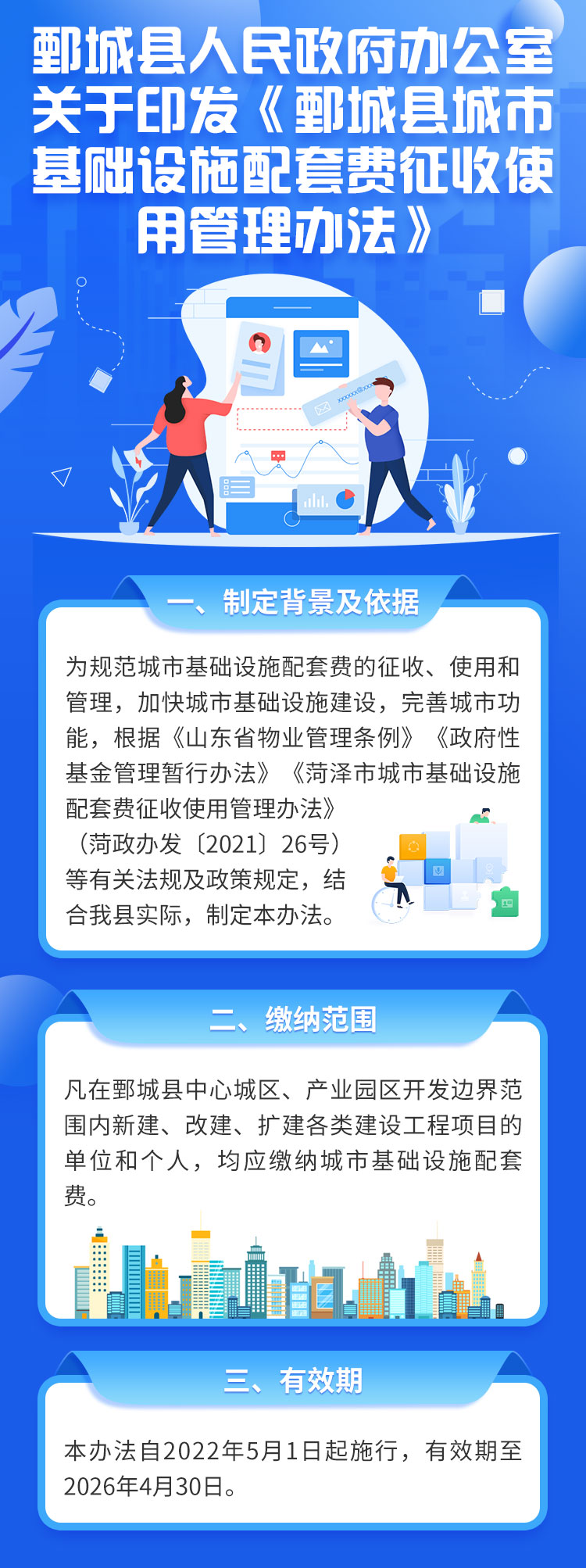 • 標  題:【圖文解讀】鄄政辦發〔2022〕3號 鄄城縣人民政府辦公室關于印發《鄄城縣城市基礎設施配套費征收使用管理辦法》的通知