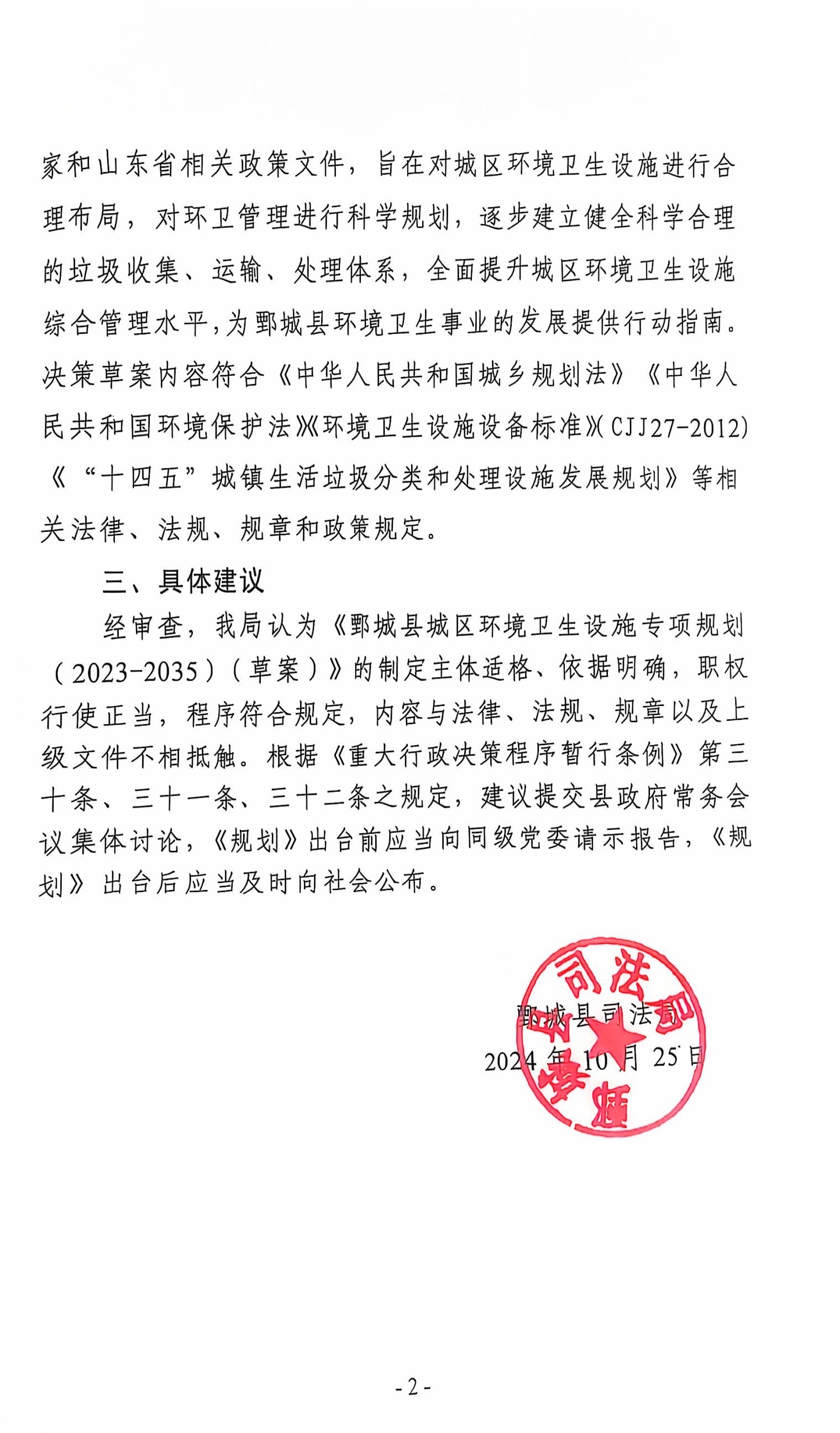 • 內容概述:鄄城縣司法局關于《鄄城縣城區(qū)環(huán)境衛(wèi)生設施專項規(guī)劃(2023-2035年)》合法性審查意見書