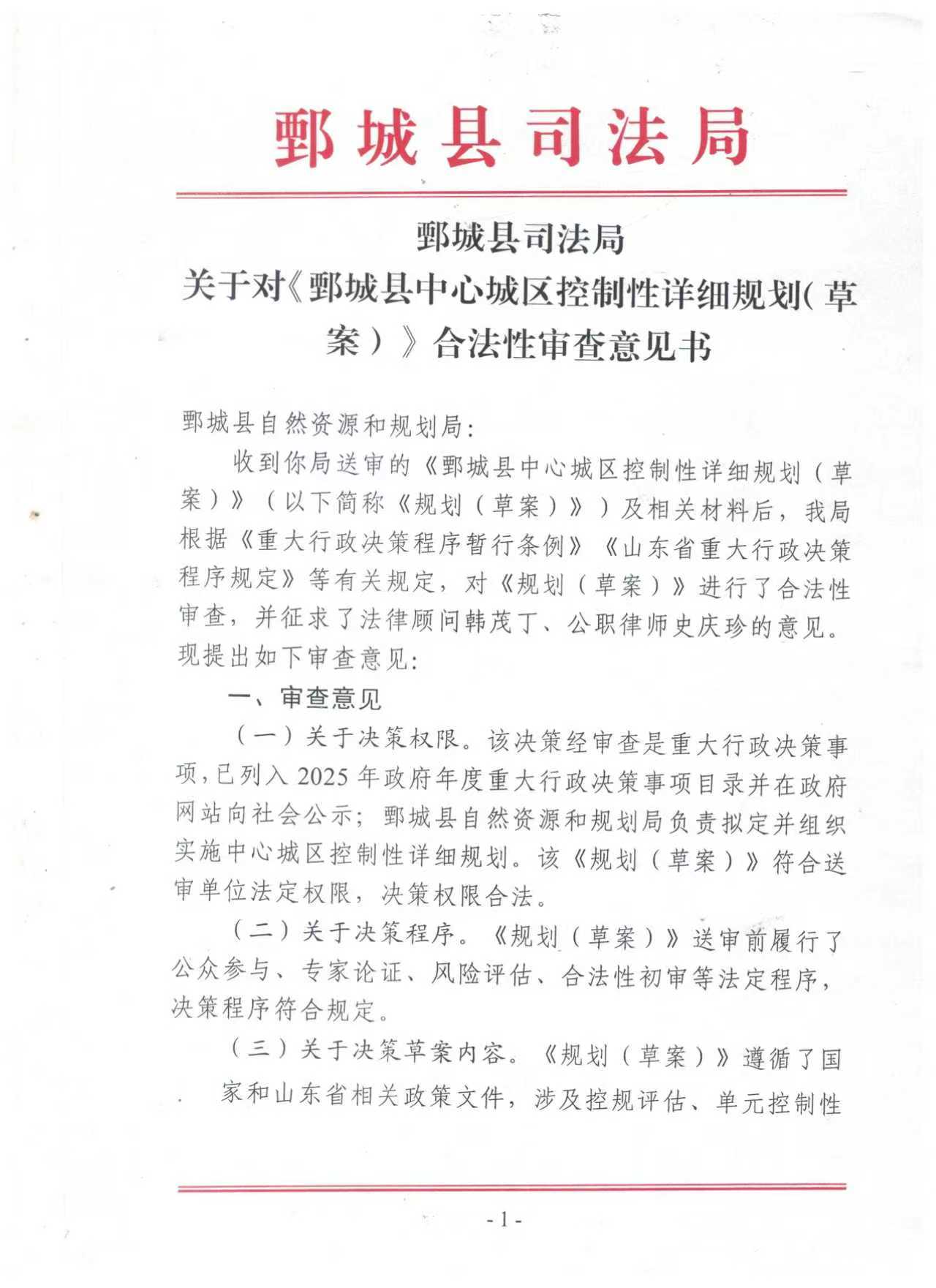 鄄城縣司法局關(guān)于《鄄城縣中心城區(qū)控制性詳細(xì)規(guī)劃(草案)》合法性審查意見書