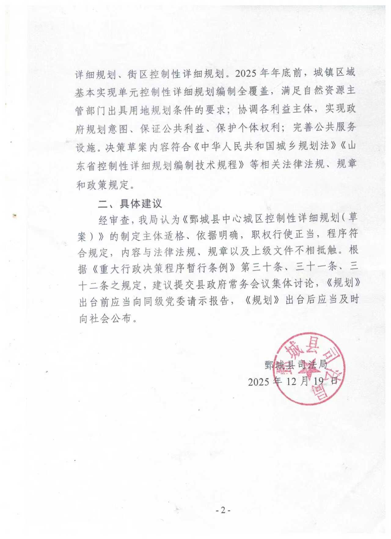 標(biāo)  題: 鄄城縣司法局關(guān)于《鄄城縣中心城區(qū)控制性詳細(xì)規(guī)劃(草案)》合法性審查意見書 發(fā)布日期: 2025 年 12 月 19 日