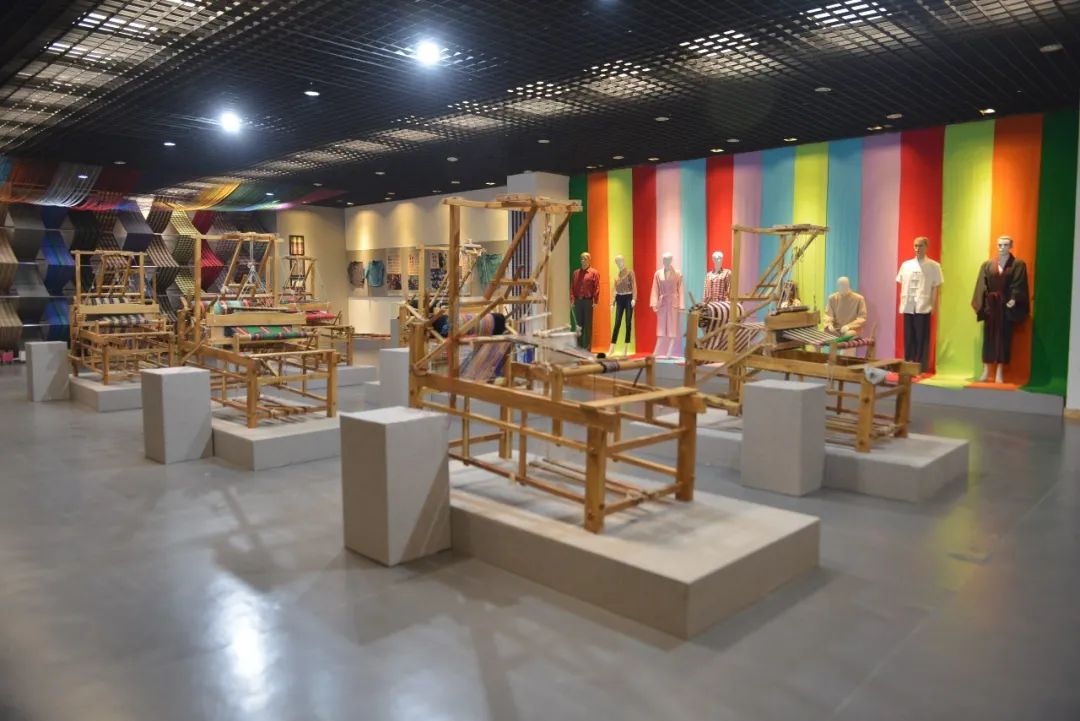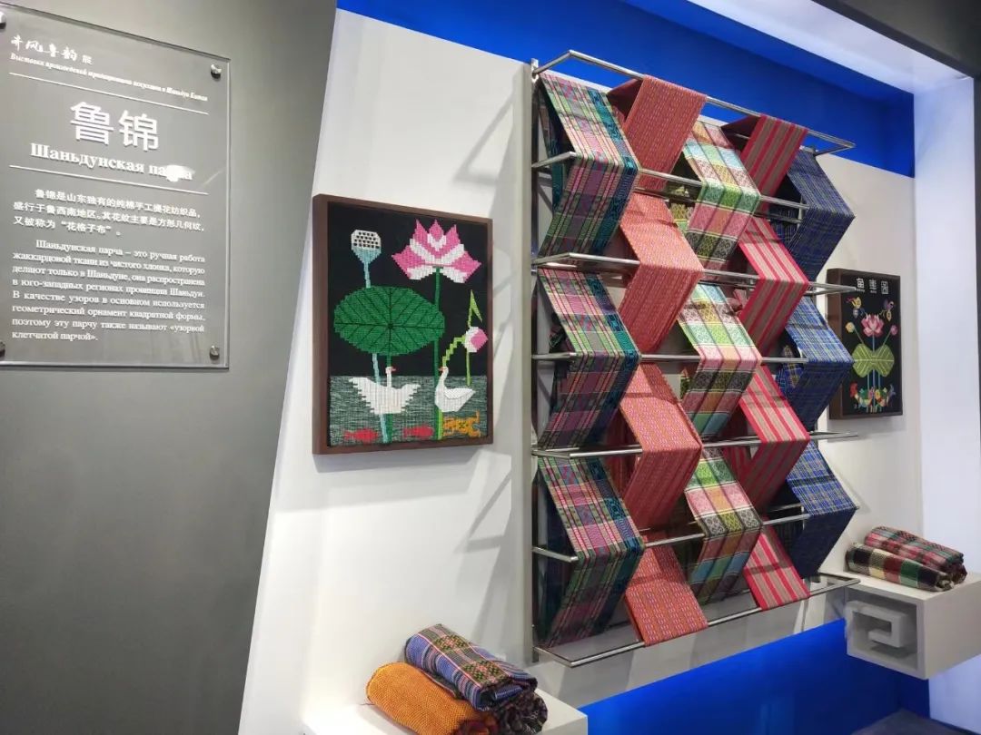 魯錦展廳中手織魯錦面料及魯錦壁掛展示。魯錦是國家級非物質文化遺產,是中國傳統手工織造技藝的代表之一。中國魯錦博物館位于菏澤市鄄城縣,是國家級非物質文化遺產專題博物館,主要征集、收藏、展示魯錦文化及研究魯錦工藝。