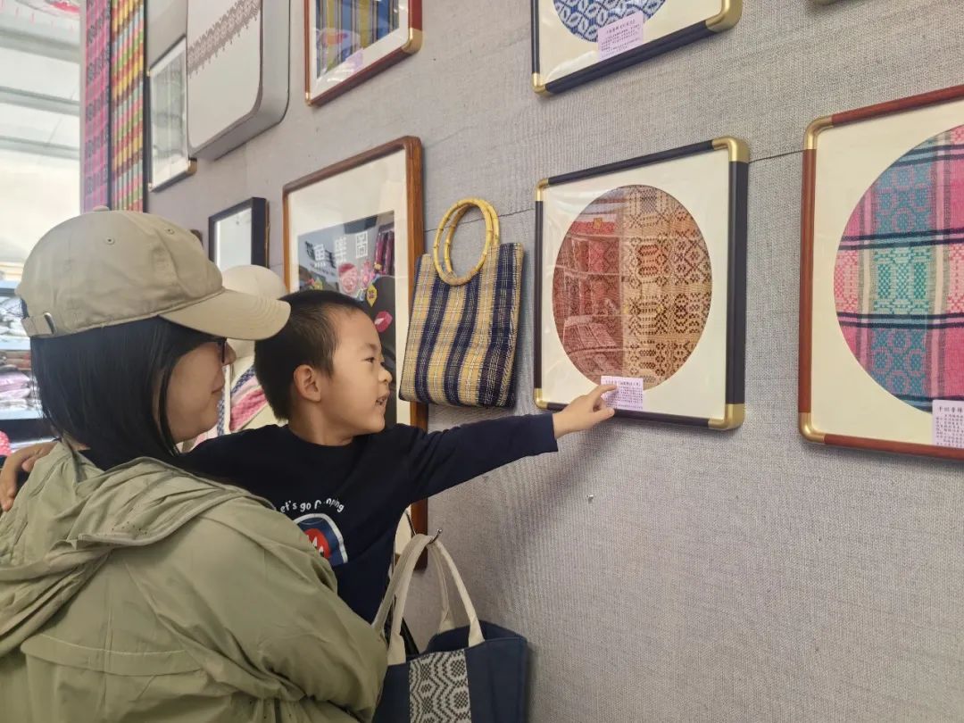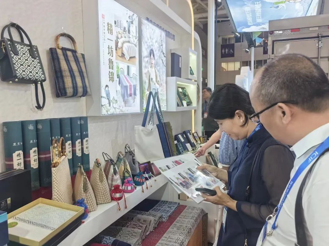 觀眾正在參觀魯錦文創產品。魯錦是國家級非物質文化遺產,是中國傳統手工織造技藝的代表之一。魯錦文創產品品種豐富,融文化性、藝術性和實用性于一體。