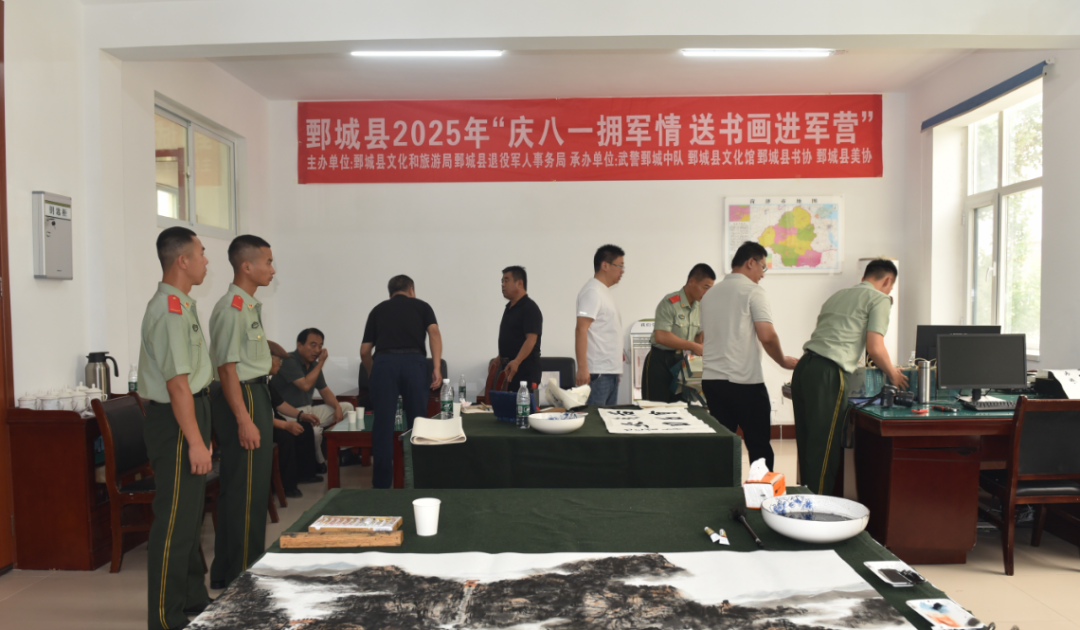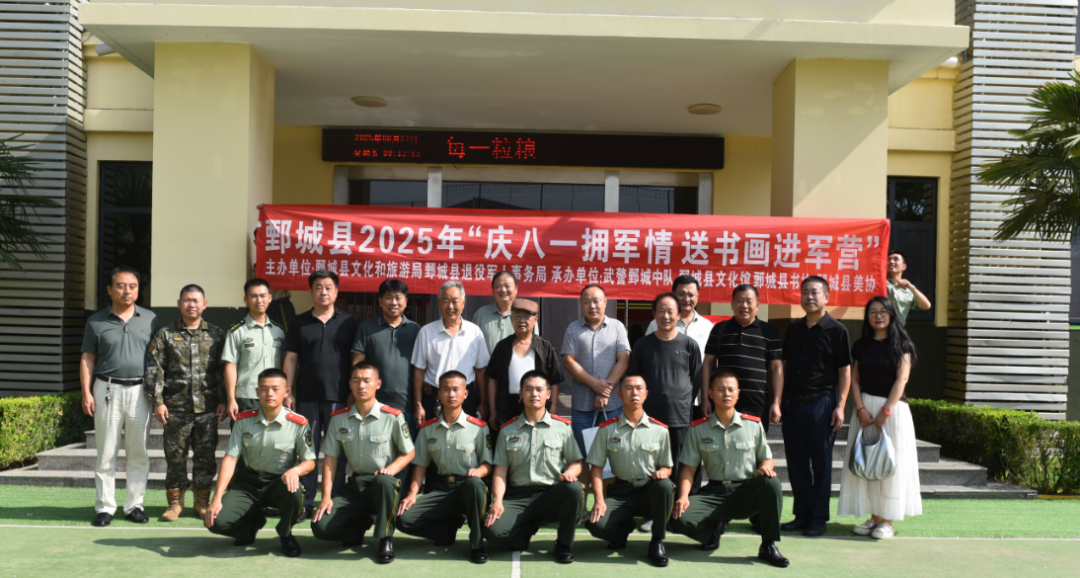為熱烈慶祝中國人民解放軍建軍98周年,進一步弘揚擁軍優屬光榮傳統,密切軍民魚水情誼,2025年8月1日,由鄄城縣文化和旅游局、鄄城縣退役軍人事務局主辦,武警鄄城中隊、鄄城縣文化館、鄄城縣書法家協會、鄄城縣美術家協會共同承辦的“慶八一擁軍情 送書畫進軍營”活動在武警鄄城中隊營區成功舉辦。