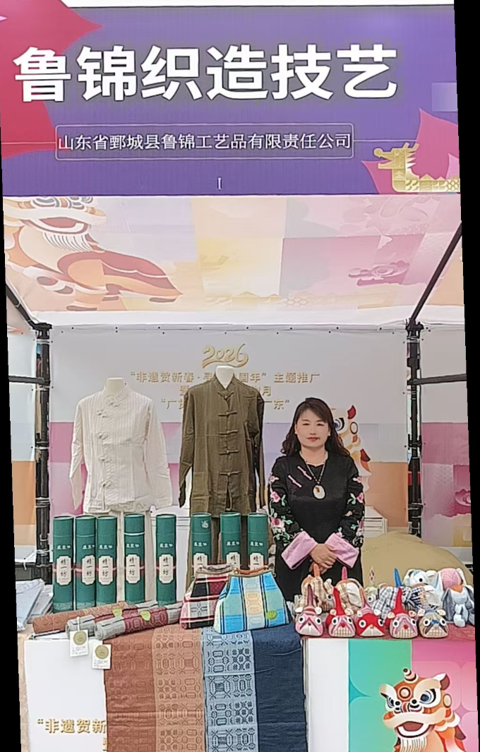 1月26日,2026年“非遺賀新春·尋味中國年”主題推廣暨非遺年貨購物月在廣州盛大啟幕。在這場匯聚全國15個省區市及港澳地區130余個非遺項目的文化盛會上,鄄城魯錦作為山東省代表項目之一,于“華衣煥新顏”展區驚艷亮相,向全國觀眾展示其跨越千年的織造智慧與當代活力。