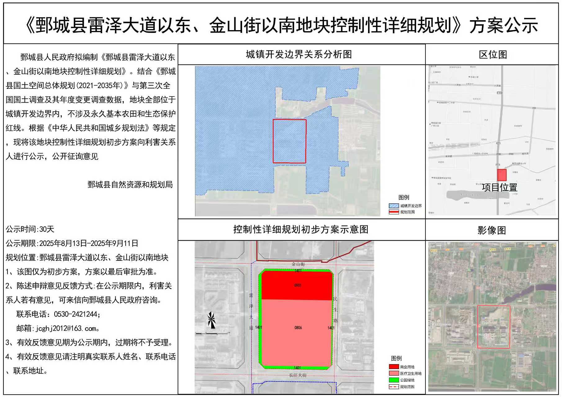 標  題: 《鄄城縣雷澤大道以東、金山街以南地塊控制性詳細規劃》方案公示 發布日期: 2025 年 08 月 13 日